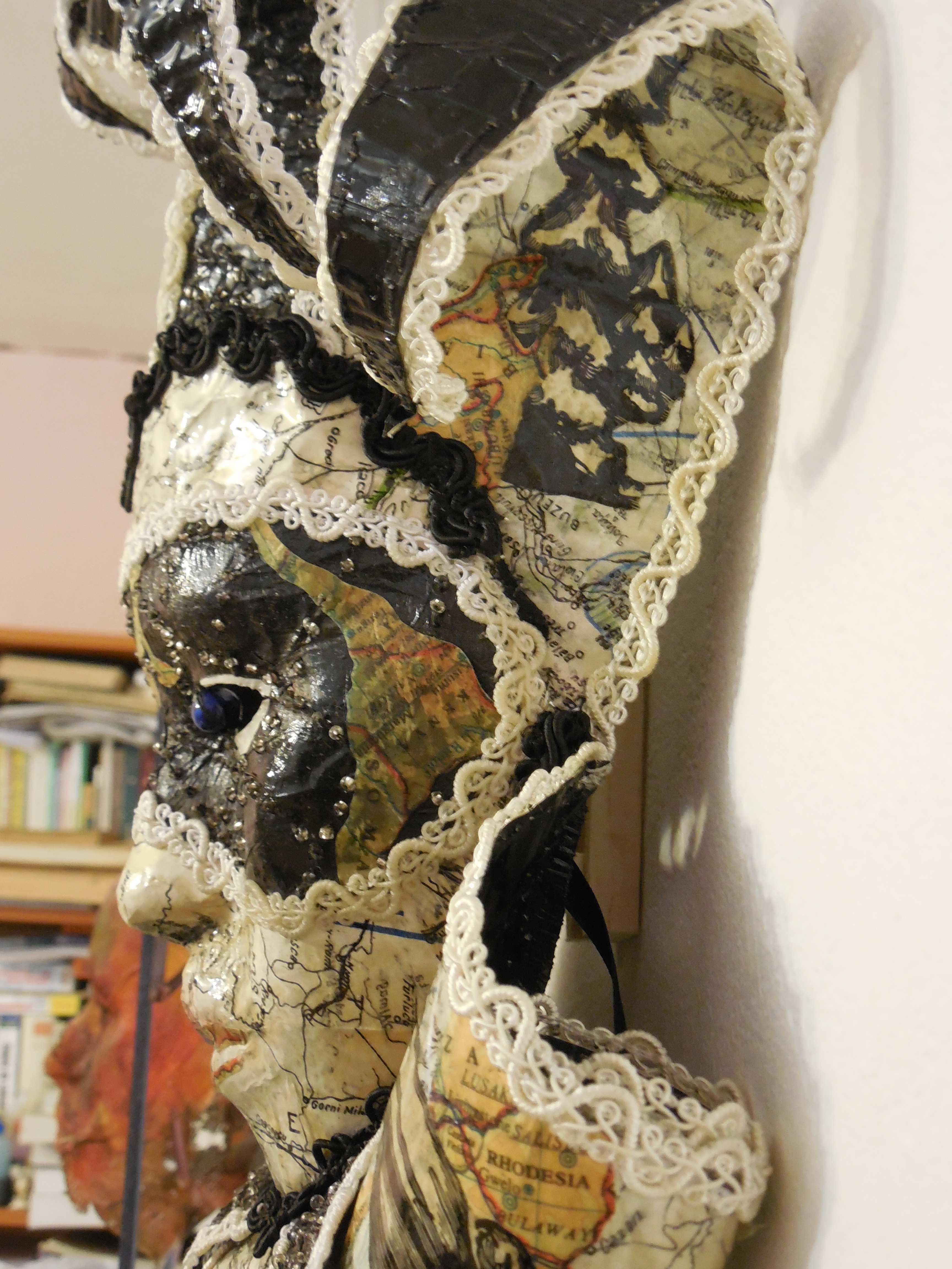 So, I took the base I had and decorated it with a collage from maps, beads and lace. I added the pointy hat and collar and it was done. Fast and simple! Just joking! It took about a week, but mostly because I have a day job.