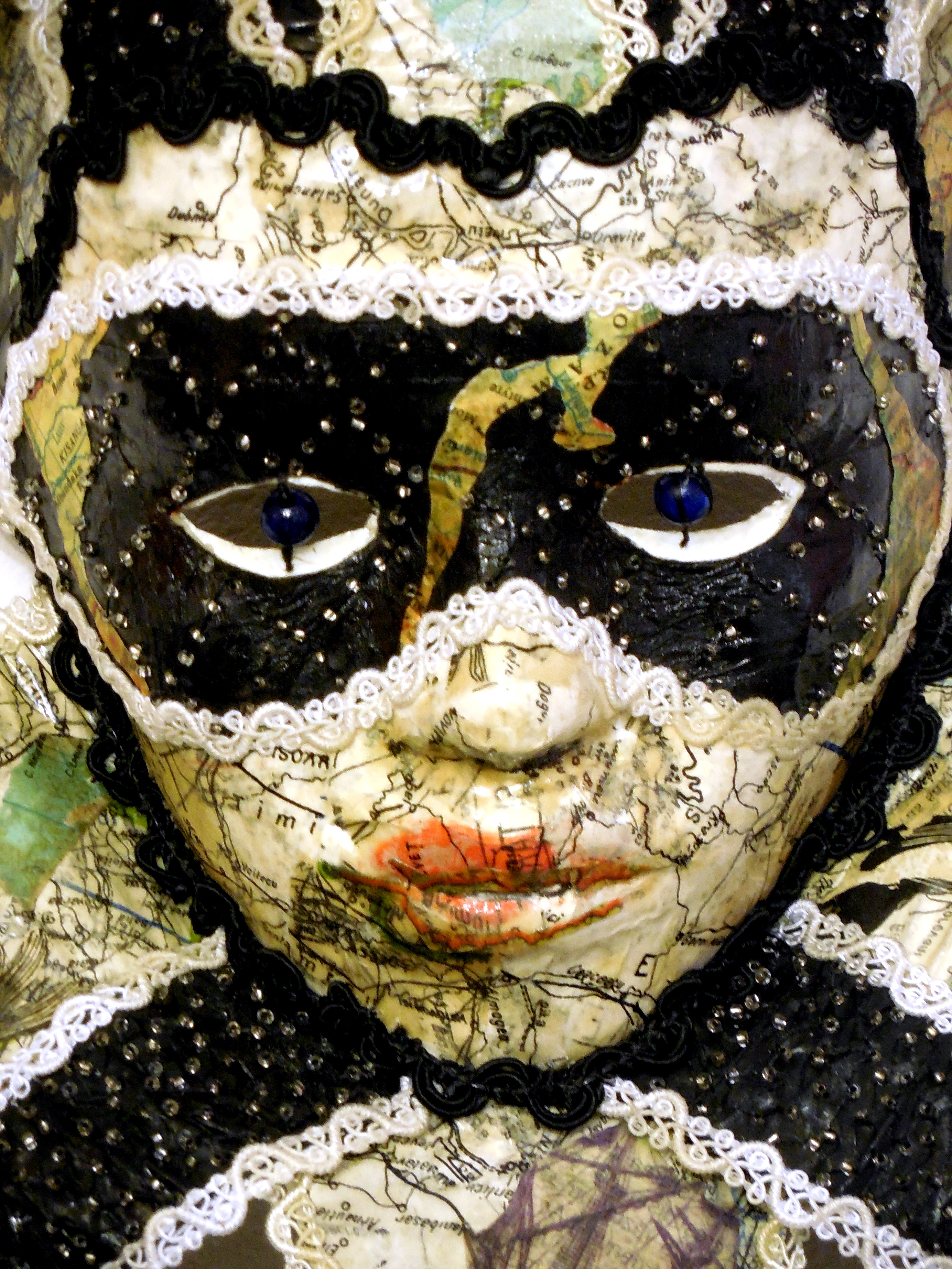 Working on this mask gave me some new ideas. I like the effect that the lace creates on the edges and I also like decorating with beads. I did not want to cover the eyes that were cut on the base because it was done for a wearable mask initially, so I added the two blue beads as eyeballs. I find it more expressive like this.