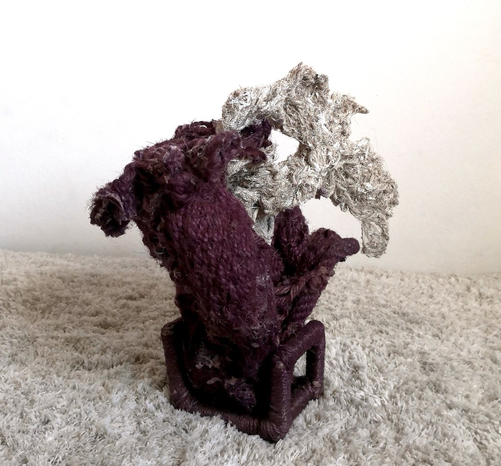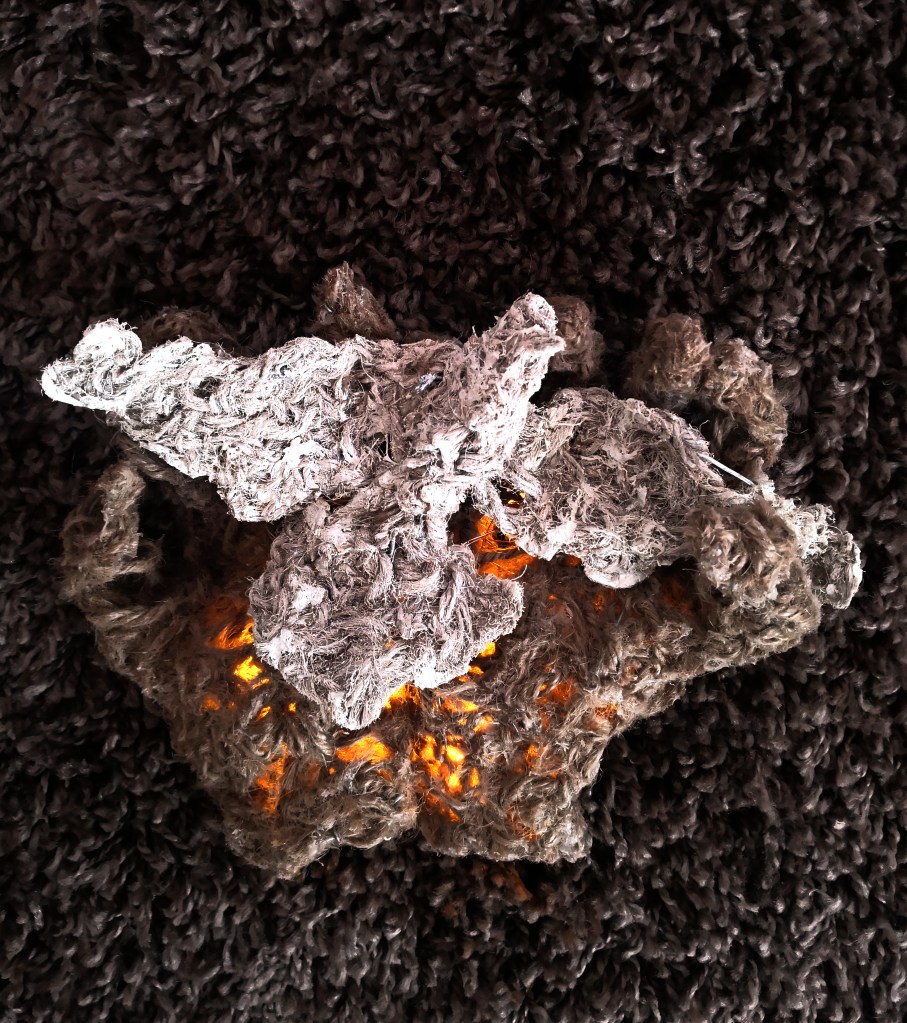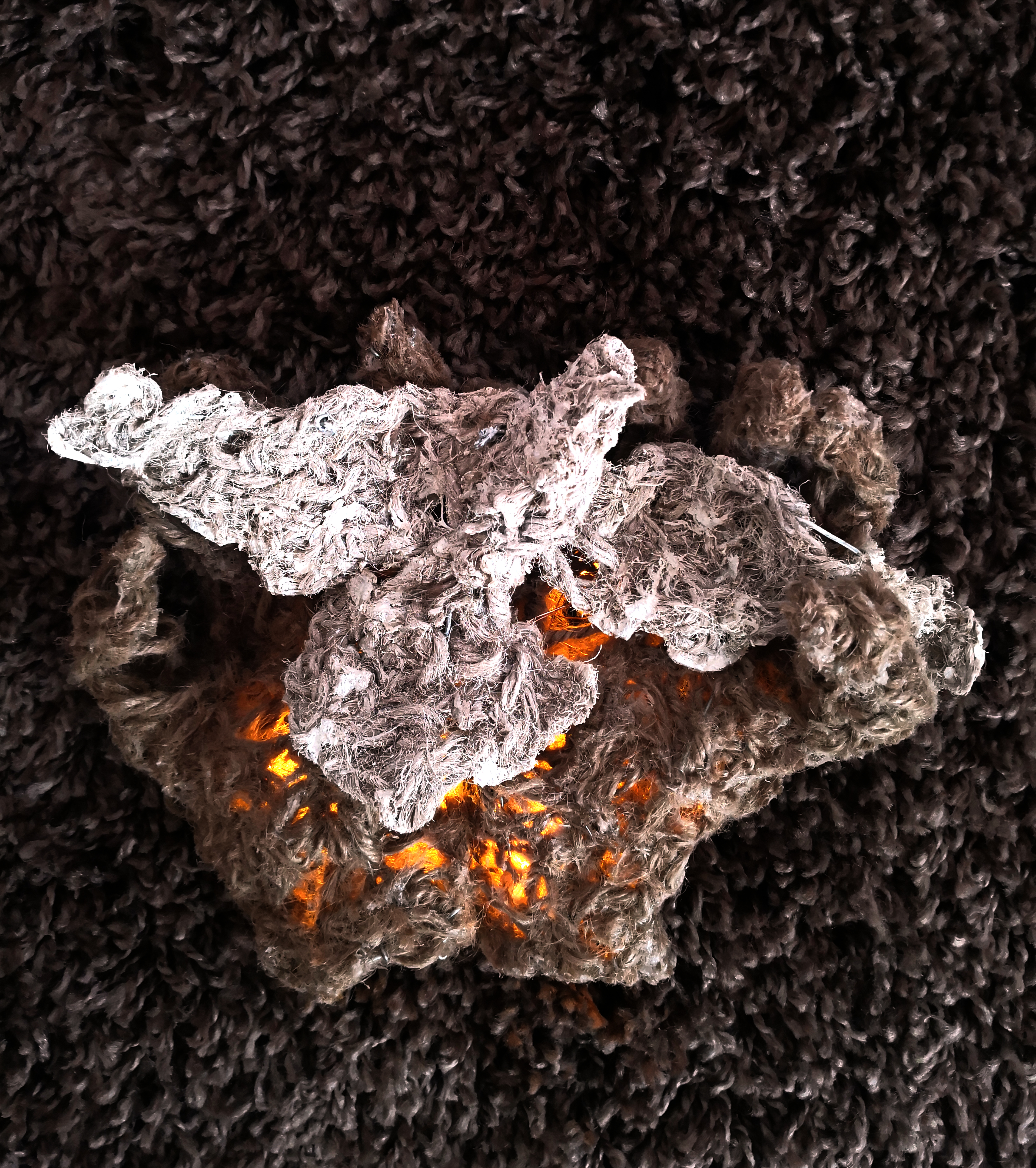How to watch a feeling die is a series of three works made of netted rope, of which the last two are interactive and react to movement : the second lights up and the third twitches one wing.