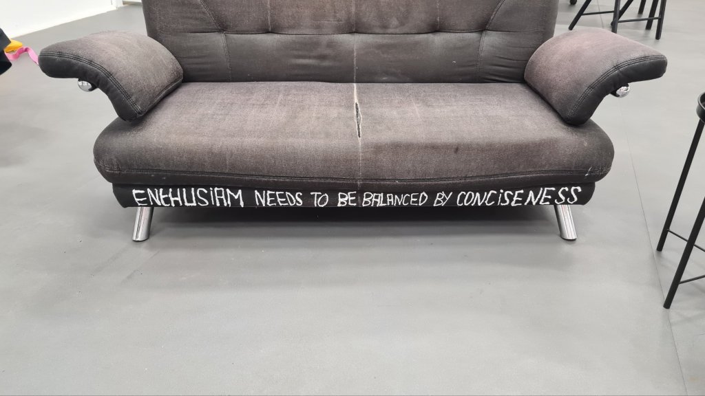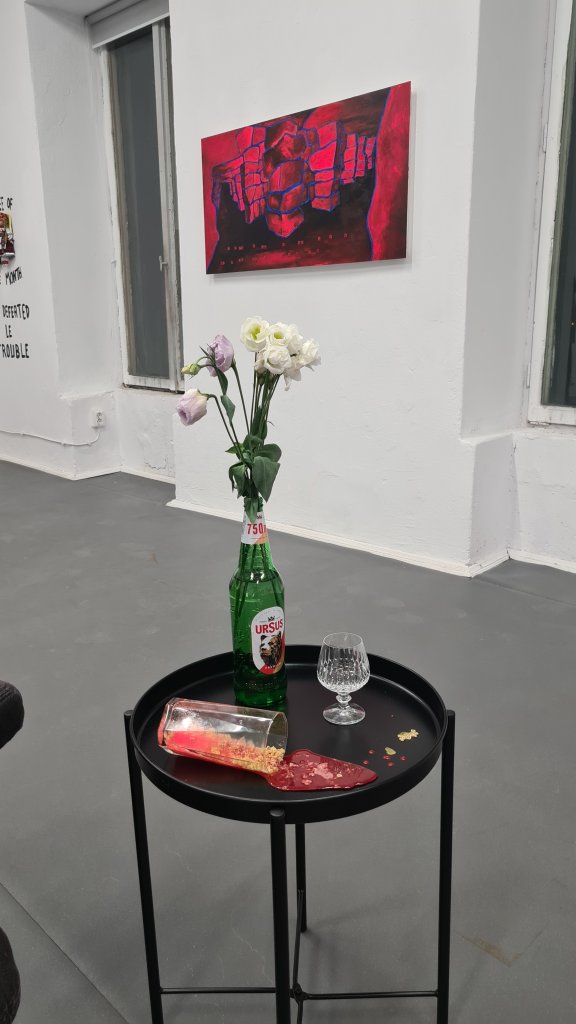 I loved everything about this exhibition. The gallery was decorated like a room. It was strangely inviting. On one table there was a glass with its contents spilled and a beer bottle with a flower in it. That would make a great decoration for my room. There were all sort of paintings on the wall with all sorts of punch lines and scattered words. The exhibition is centered around the necessity for good speach skill to succed.