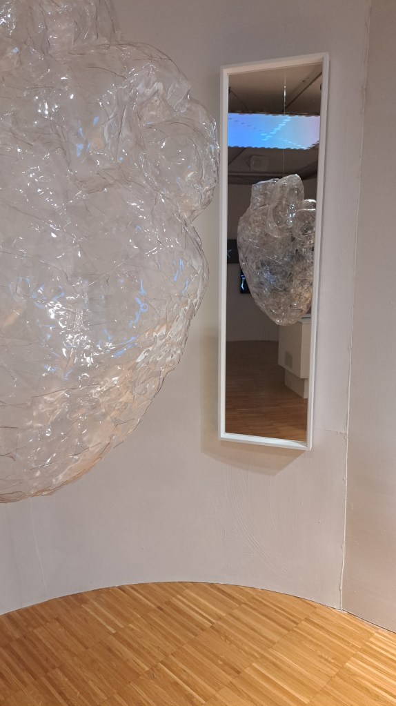 Am realizat că am sărit un pic peste etape. De fapt lucrarea lui Denis Simion mi-a luat ochii când am intrat, însă am avut nevoie sa strecor puțină joacă printre atâtea emoții. Lucrarea lui Denis este o inimă imensă, transparentă, care se reflectă în trei oglinzi. Este cât poate fi de imaterială o lucrare materială. Ador. Am stat un pic fascinata în jurul ei să priveasc inima cum se rotește și își arată toate unghiurile fie direct sau în oglinzi. Într-adevăr dacă vrei să captezi vizual sufletul, aceasta este o interpretare care cu mine a rezonat foarte mult.
