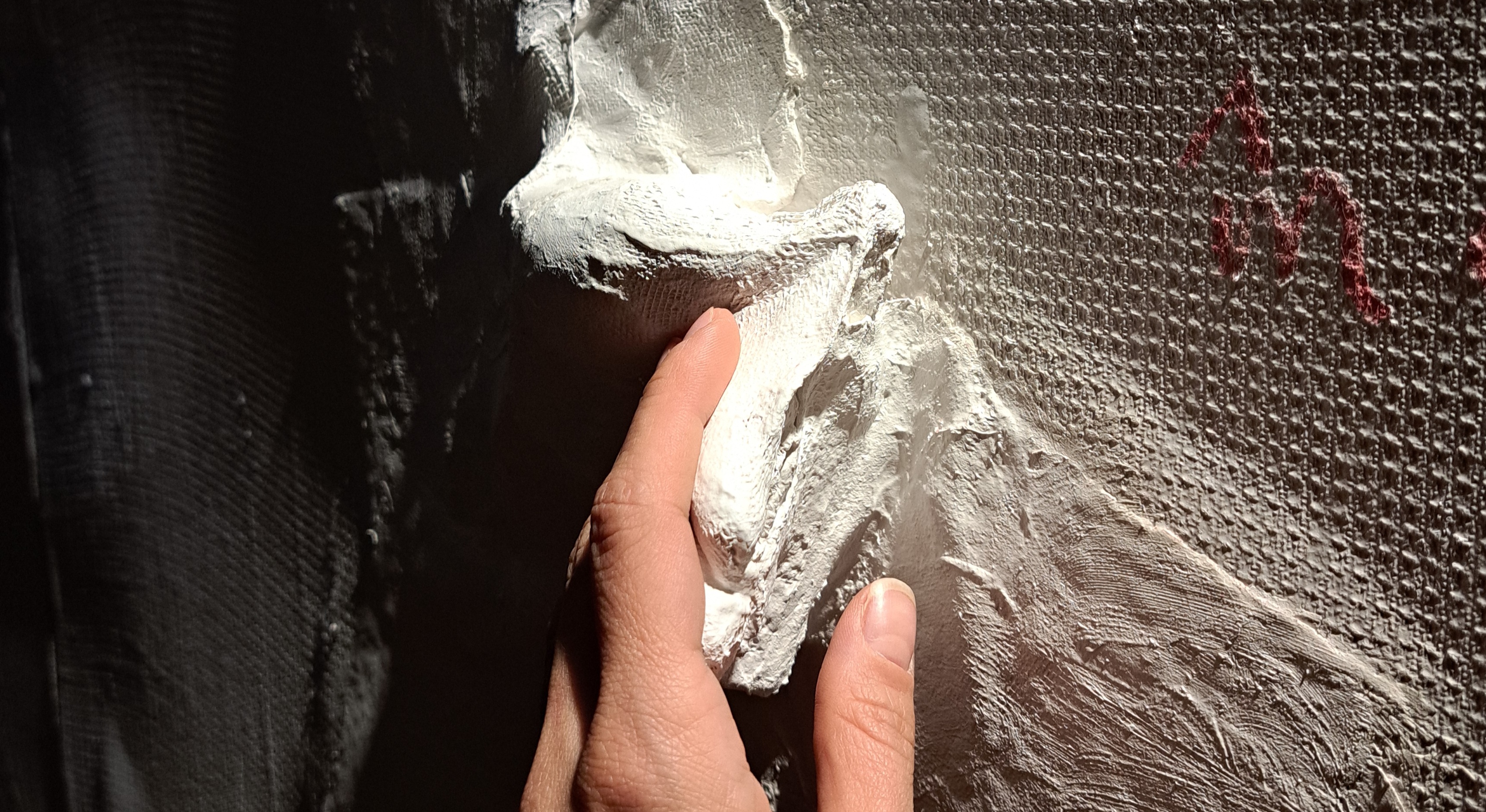 Expoziția este organizată ca un labirint, ca un corp, ca ceva organic, iar pereții au un aspect nefinisat ca și când ar fi într-o continuă transformare. Pe perete sunt scrise de mână versuri și sunt aplicate mulaje pe care Emilia le-a făcut după propriu corp. Faptul că toate aceste lucrari atât de actuale și moderne sunt într-un spațiu tactil care te îmbie să îl atingi și să te simți parte din el mi se pare minunat.