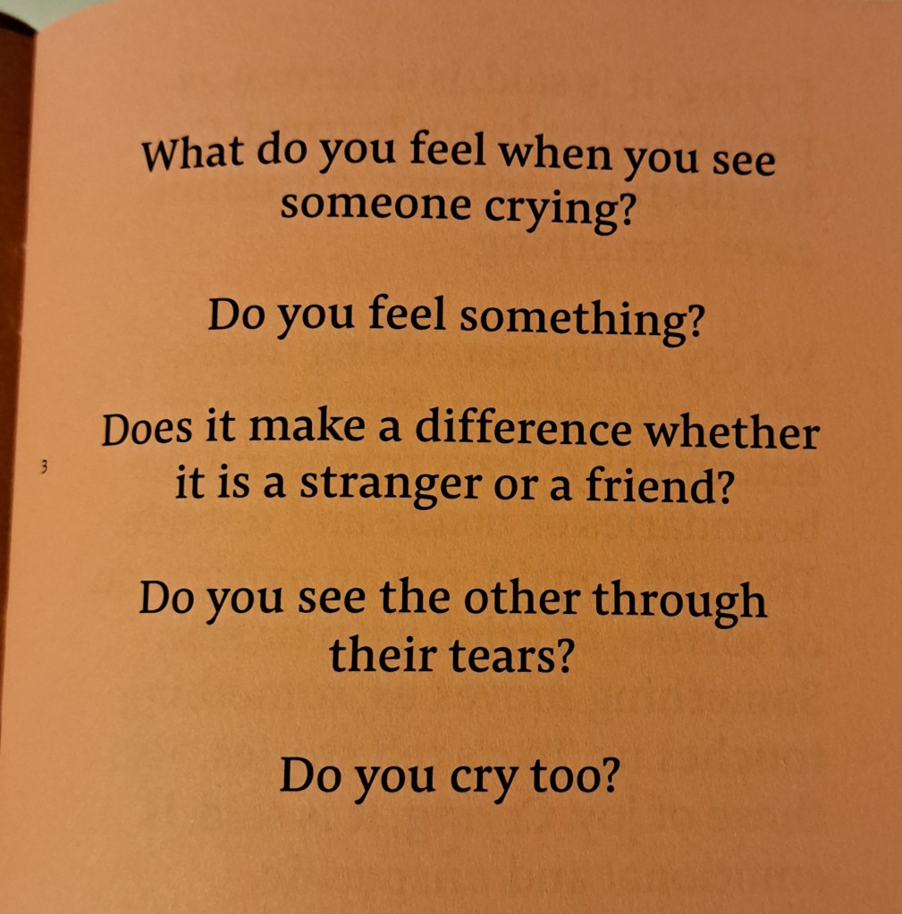 The performer asked for me to pick the color of her tears and my brain just blurted “blue” and I thought “No! Not blue! That is so boring”, but then she started crying. It looked to me like a slow motion film of someone crying as I could see how her face was slowly changing as tears were filling her eyes …her eyes, I couldn’t see her eyes from 3 m. They were just two dark wholes on her face, glisening from time to time with tears. I looked into her eyes, though I am pretty sure she couldn’t see mine. I was thinking about how to communicate to her without words that it is ok to cry, that it is safe to cry with me. It is something I am exploring for the past year: the ability to stay with strong emotions, mine or of other people, without reacting, just staying with these emotions, letting them be.