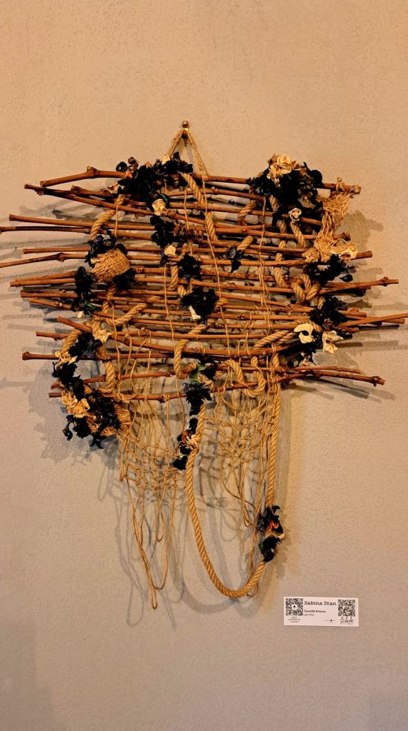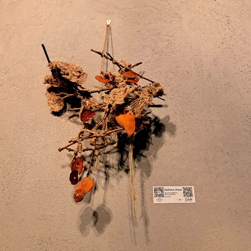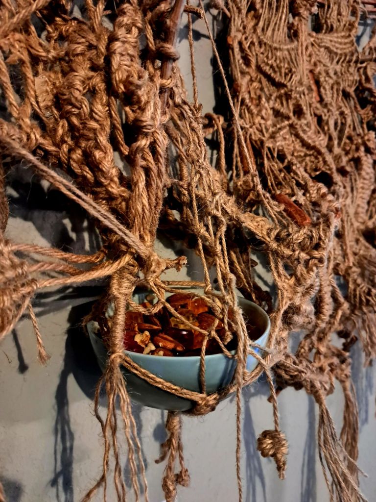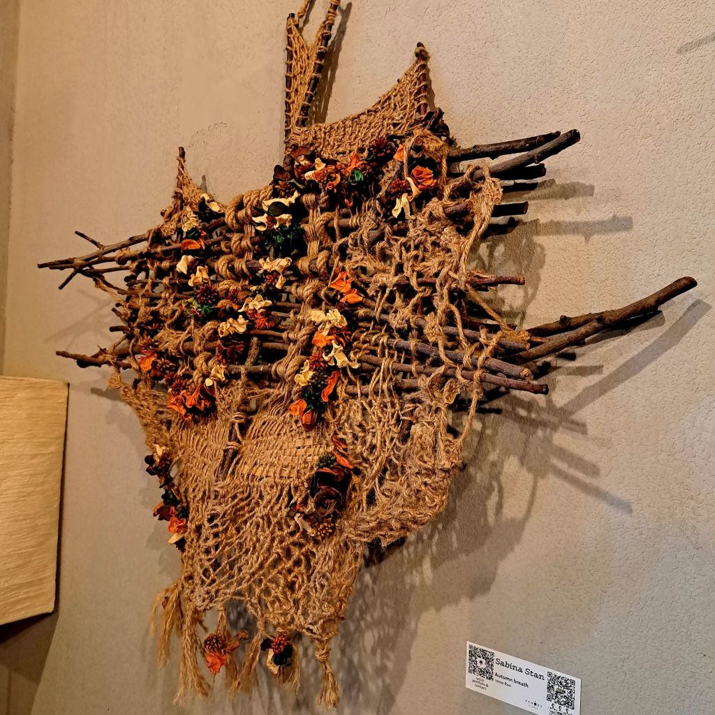 Abundență” a fost prima lucrare din cele cinci noi pe care am început-o fix în ideea de a experimenta sa vad ce iese. Am integrat niște încercări de suporți de ghivece din macrame pe care i-am făcut pentru un workshop, am combinat nodurile macrame cu tehnica mea de împletire a sforii, crengi și coji de portocale. Nu avea nicio noimă până când, la întoarcerea din retreat, în suportul central am pus un bol cu munchies: migdale, nuci etc. Atunci a venit și numele și ideea de artă care hrănește vizitatorul la propriu, nu doar spiritual. De la începutul anului s-au aranjat lucrurile în așa fel încât tot ce am dat s-a întors la mine exponențial. Cum ar zice Gabi Mitan – “dai dragoste, ai dragoste“.