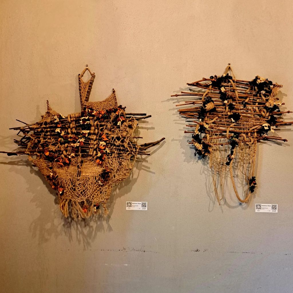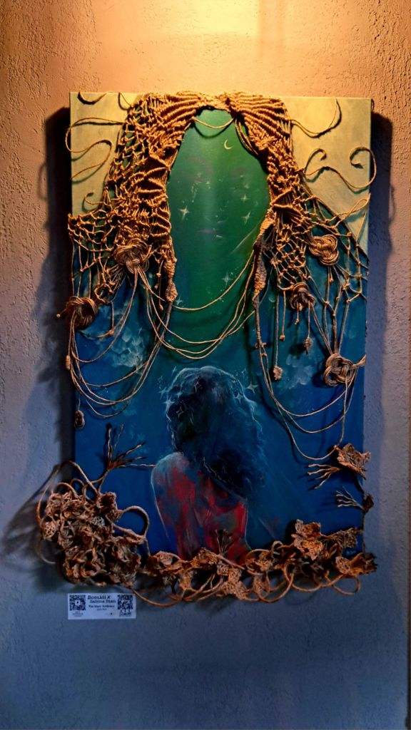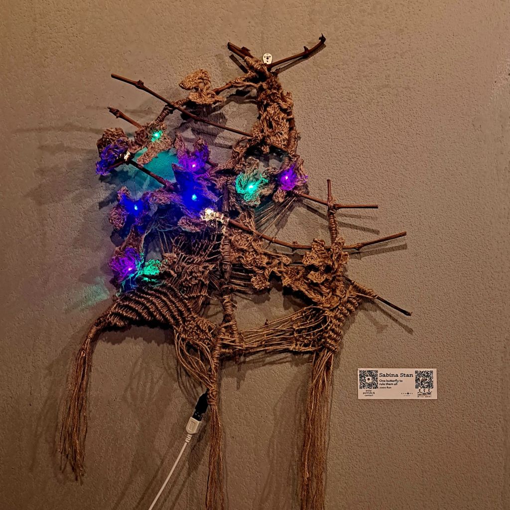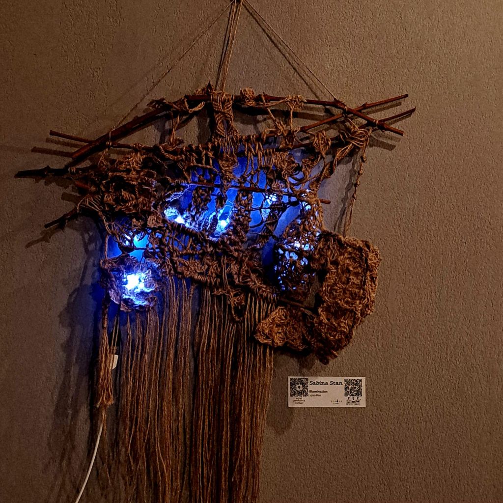 Abundență” a fost prima lucrare din cele cinci noi pe care am început-o fix în ideea de a experimenta sa vad ce iese. Am integrat niște încercări de suporți de ghivece din macrame pe care i-am făcut pentru un workshop, am combinat nodurile macrame cu tehnica mea de împletire a sforii, crengi și coji de portocale. Nu avea nicio noimă până când, la întoarcerea din retreat, în suportul central am pus un bol cu munchies: migdale, nuci etc. Atunci a venit și numele și ideea de artă care hrănește vizitatorul la propriu, nu doar spiritual. De la începutul anului s-au aranjat lucrurile în așa fel încât tot ce am dat s-a întors la mine exponențial. Cum ar zice Gabi Mitan – “dai dragoste, ai dragoste“.