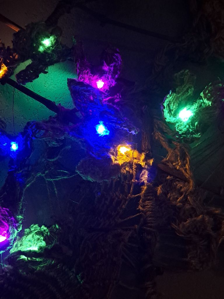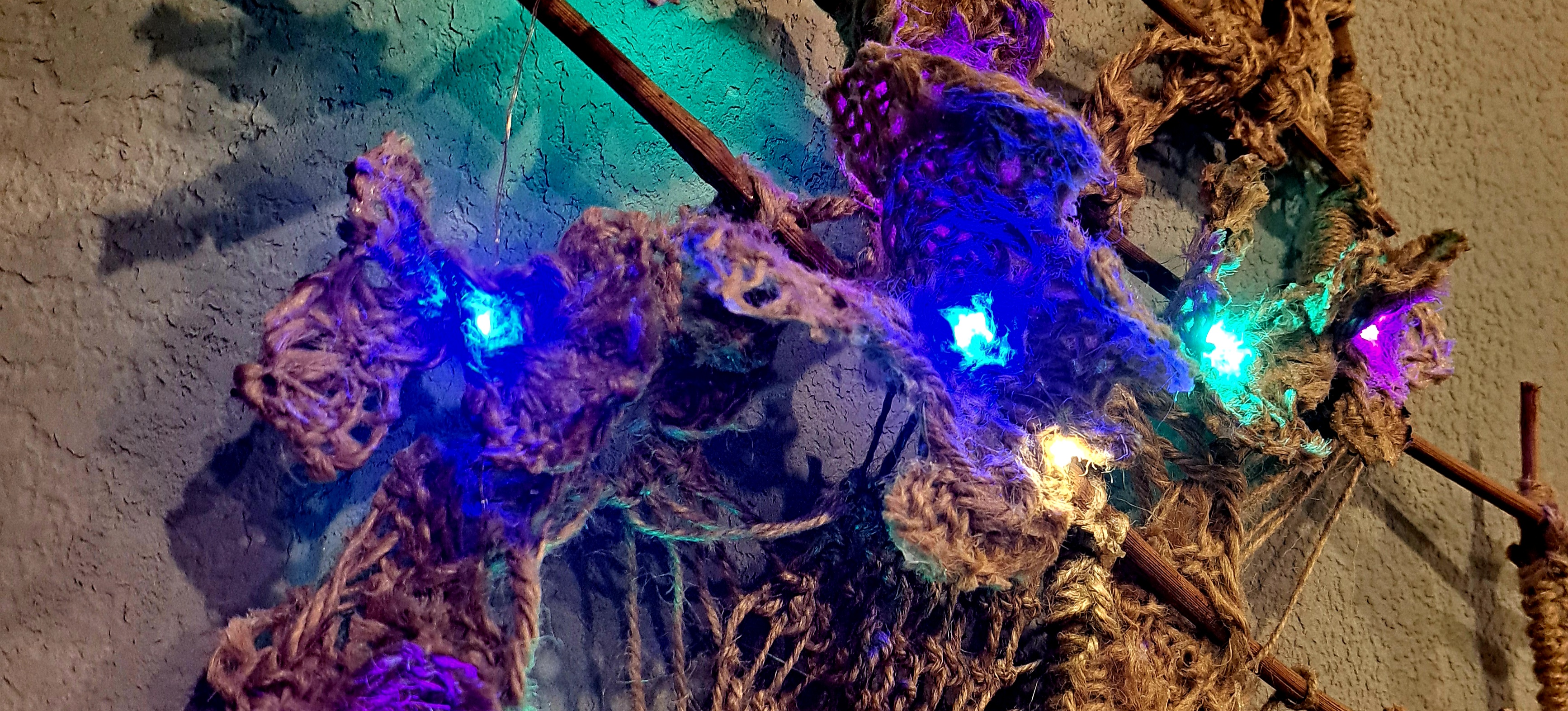 Iluminare” avea elementele create de dinainte de retreat, dar s-au legat în ceva coerent tot la întoarcere. Am pus ghirlanda de leduri cu sursa de lumină la floare către pasăre care o primește prin creștetul capului.