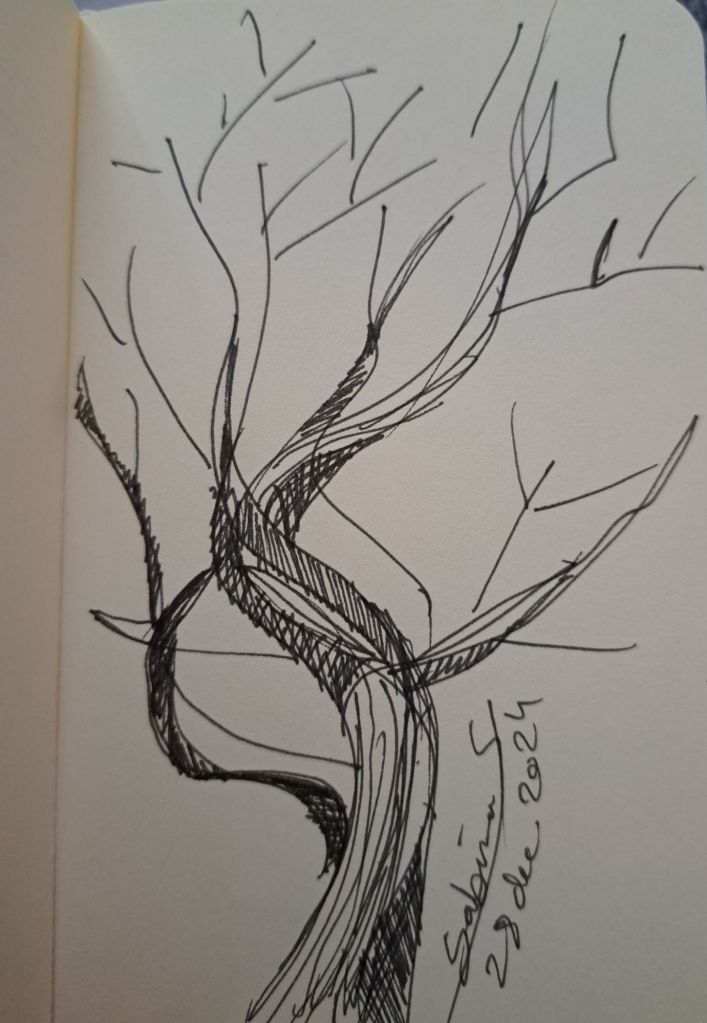 From 28th evening, after I isolated my windows and turned off the light I was in darkness and started the exercise of doing everything very slowly for 24 hours (I kept it up until I went to bed the next day). Once I started moving slowly everything I did felt like a meditation. I was quite fascinated. Moreover, I started chanting Shambo in my head almost continuously. It’s not something that I could keep up moving normally the next days, only when I was standing still (including in the mind). So, on the 29th, I walked very slowly around the room, I drank water slowly, as well as any other action I took, I tried to take it as slow as possible. My mind cleared and I could see concrete steps I need to take to do whatever I was thinking about doing in the begining of 2025. I wrote down (in the dark, yes) what seemed most important to me, though the ideas didn’t leave me through the days, but only became stronger. The writing I didn’t manage to do slowly though, even if opening the notebook and all the other actions around were slow. I didn’t even think about writing slowly, the ideas just needed to flow out. Drawing slowly was a challenge also. I spent an hour drawing a tree, but every time a thought came, my hand would move as usually again.
