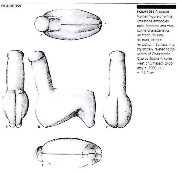 Furthermore, intersex people are depicted in Neolithic art. Gimbutas portrays this statues as a depiction of the male God, but I actually think this statuet is that of an intersex person, with breast and a penis.