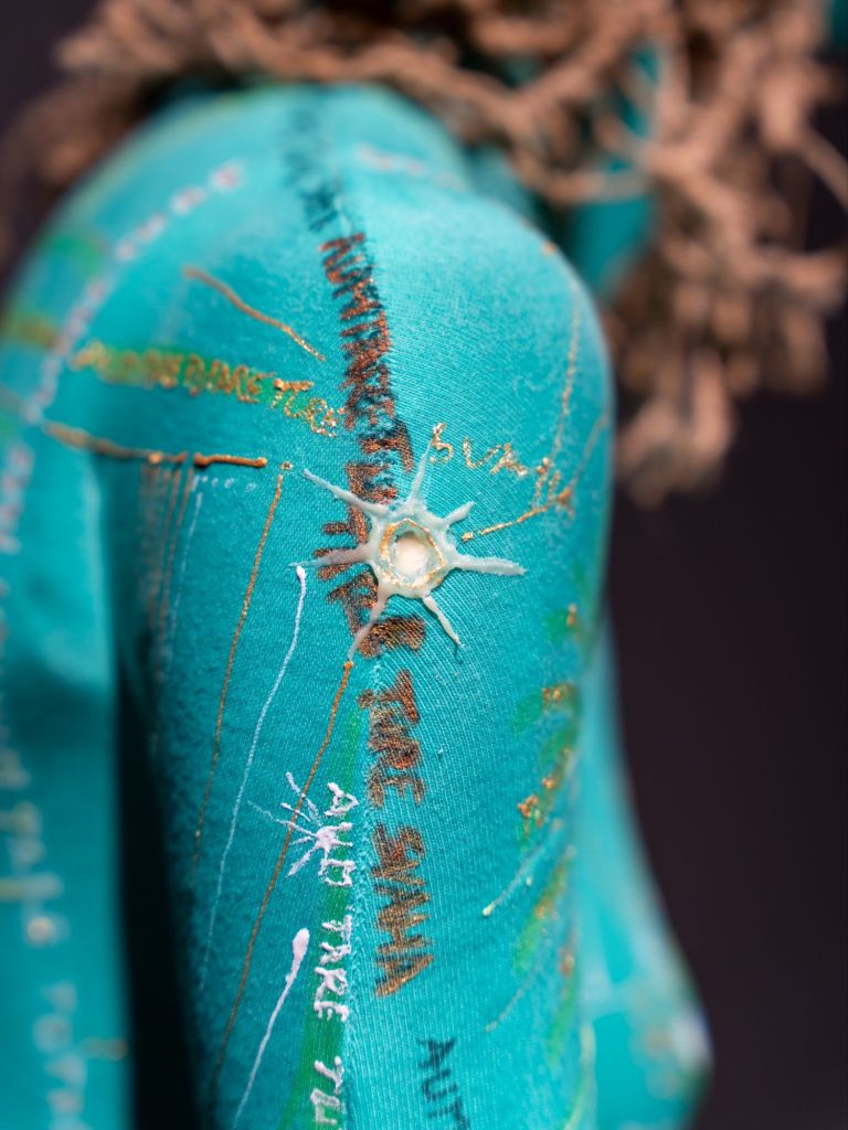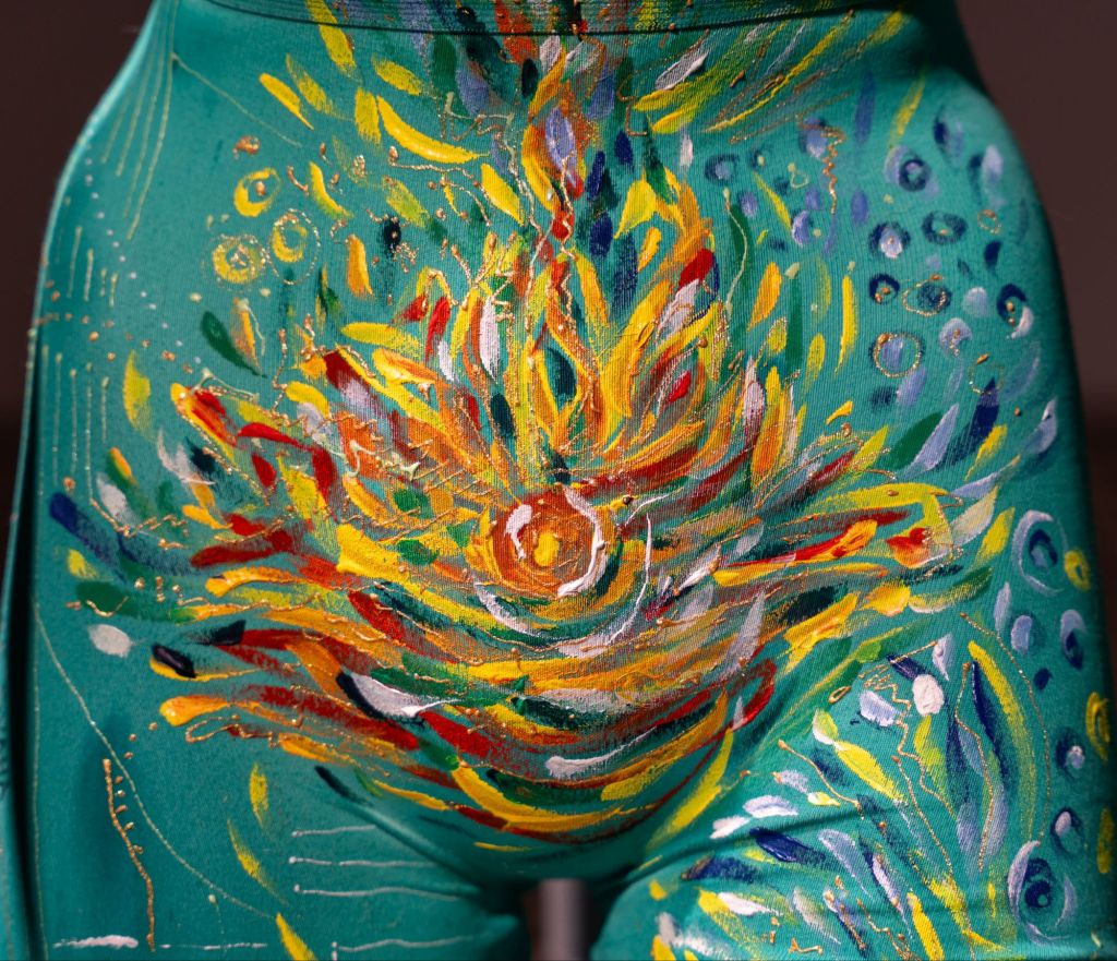Bonus: flourescent paint highlights small and pointing fingers in a reference to sign language sign for “love”.