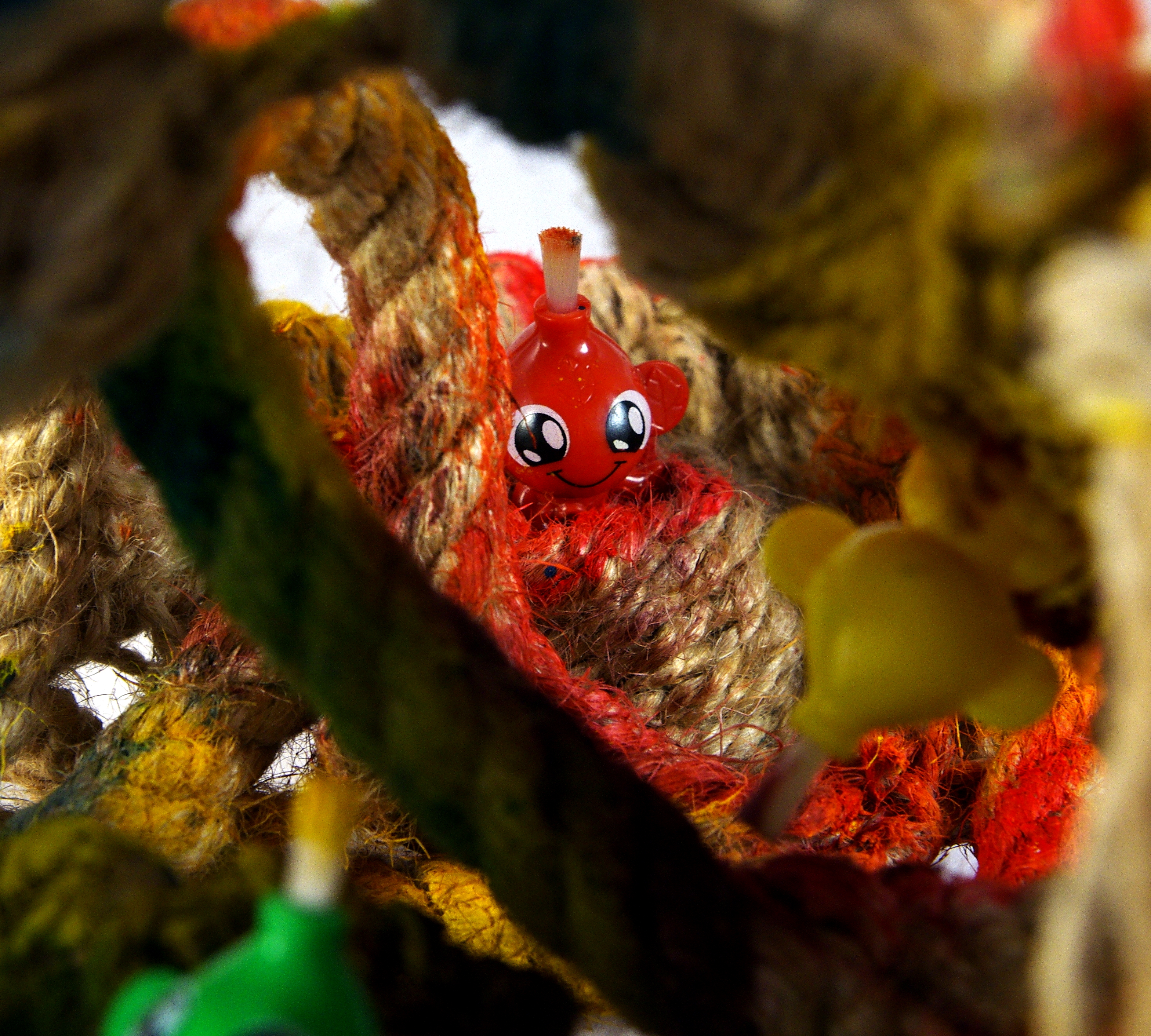 In 2015, I created a miniature for The IX International Biennial of Textile Miniatures “Out of the box”, Gallery Arka, Vilnius , Lithuania, 19th of June – 11th of July, 2015. This miniature is composed of a netted rope box in which there is a cardboard box with toys, of which one got out into the netted box, but it is being pulled back by the ones still inside the smaller box. It is called Ideally-Make your own box. The bird toy above the netted box represents the Ideal which is something to aspire for but not necessarily to be reached. I thought since I like saying I am still a child, there is no better way to show that then to include toys in my works. Each miniature made like this is accompanied by a story you can find on my blog under the category A kinder world.