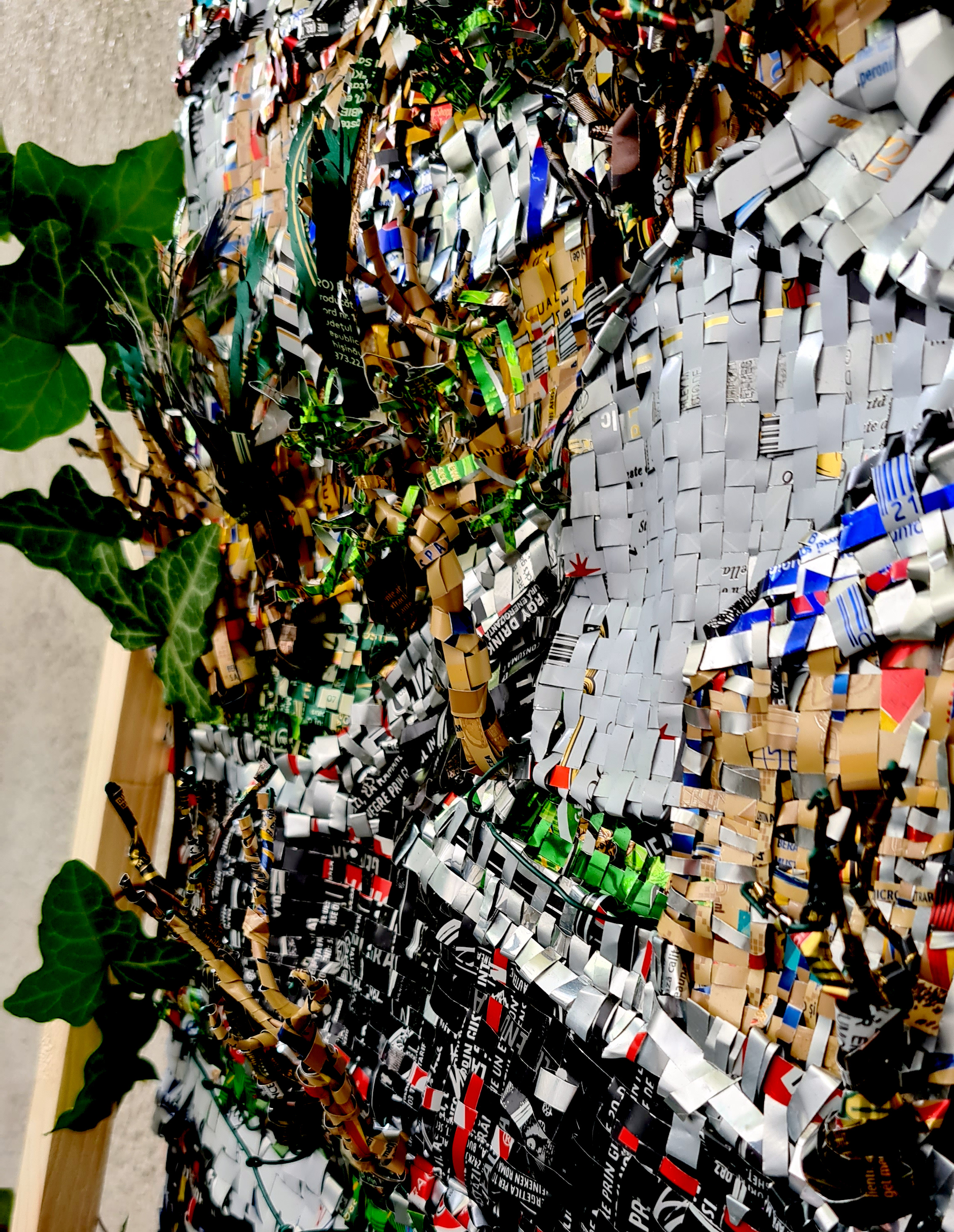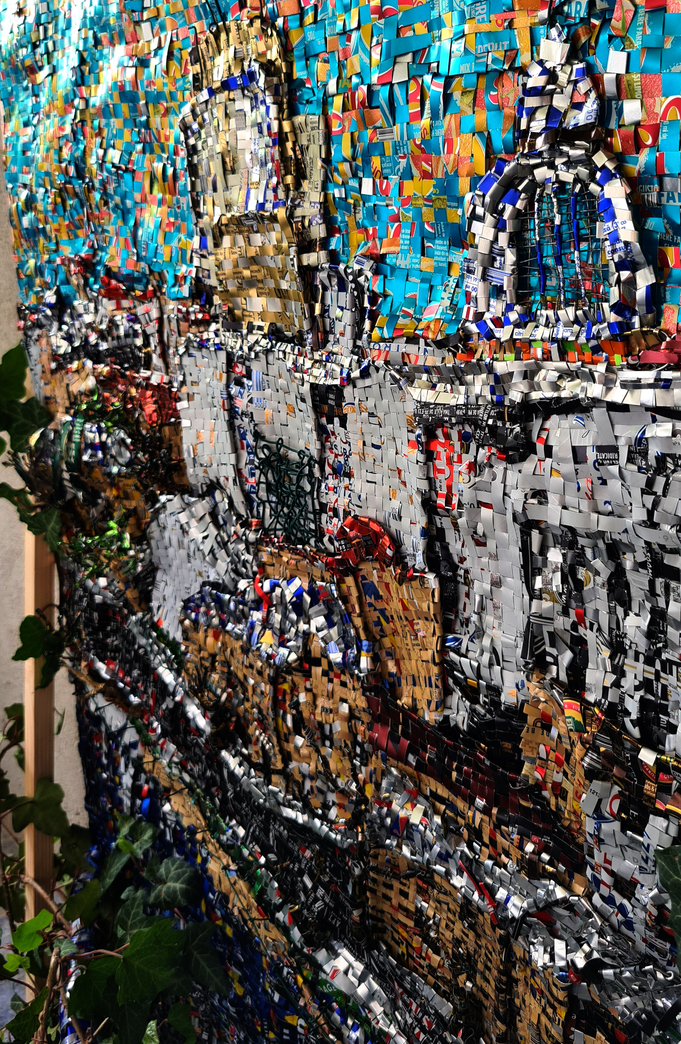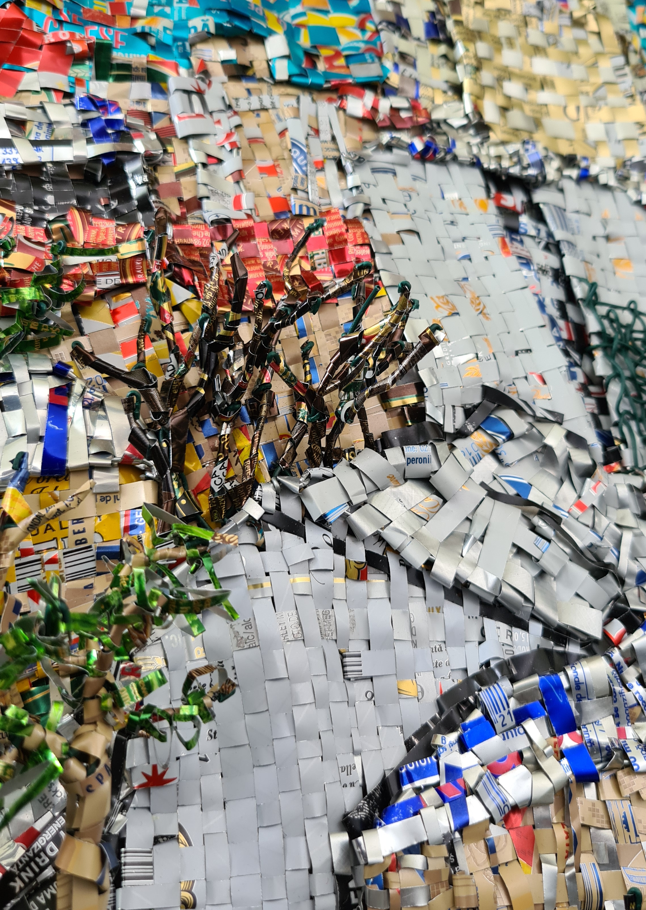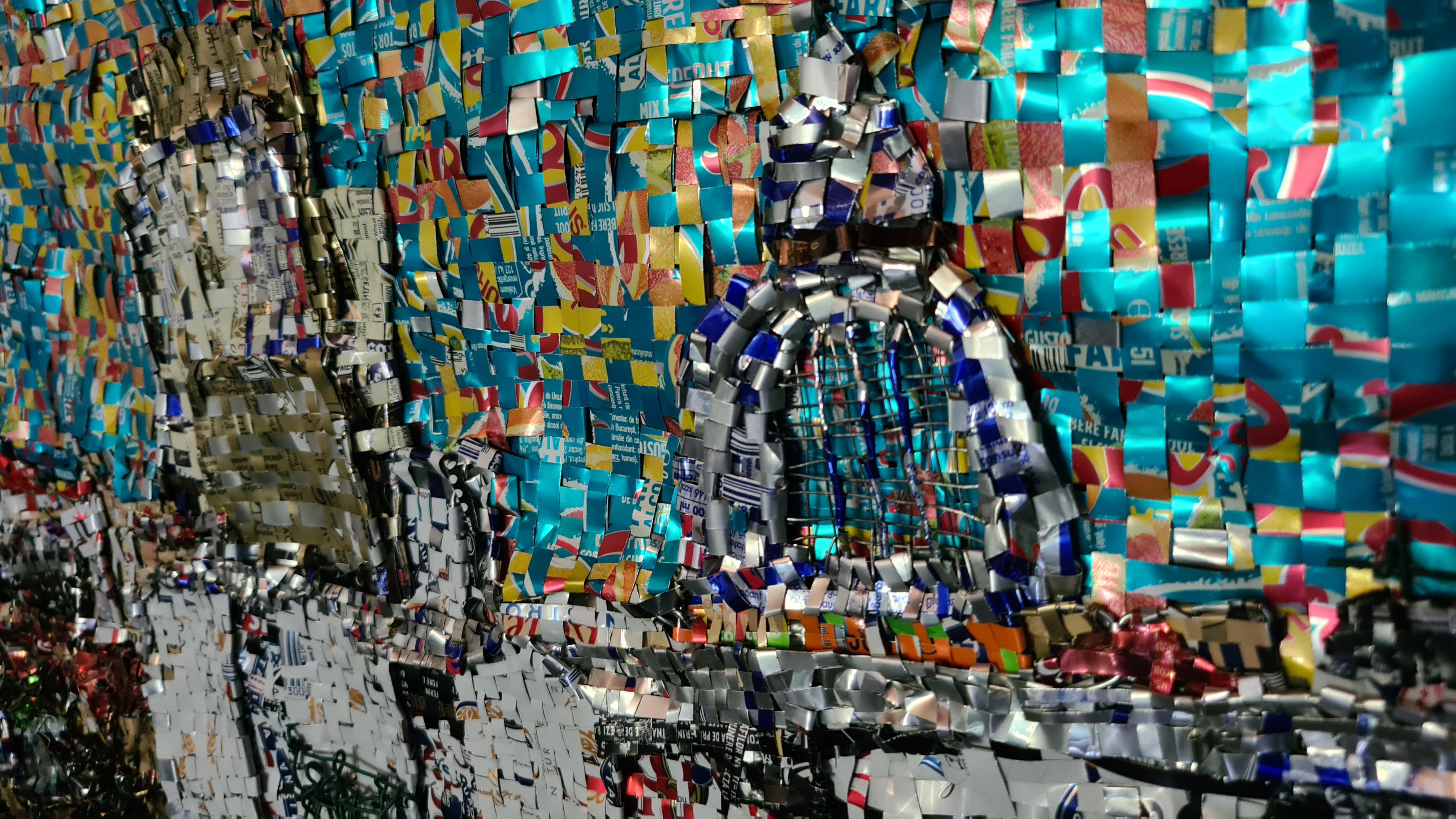 The work is made of recycled aluminium cans cut into strips and weaved on a wire structure fixed on a wood frame.