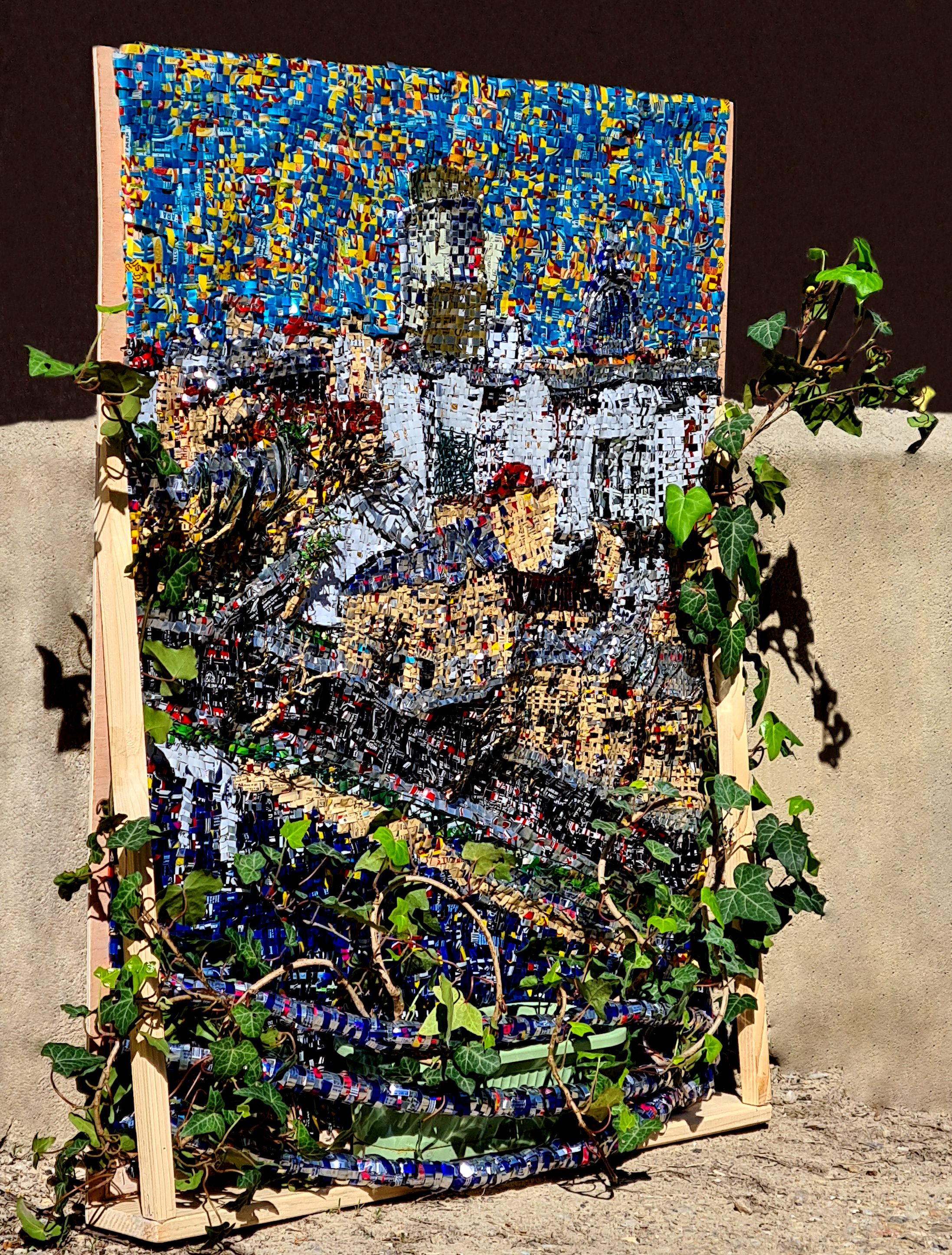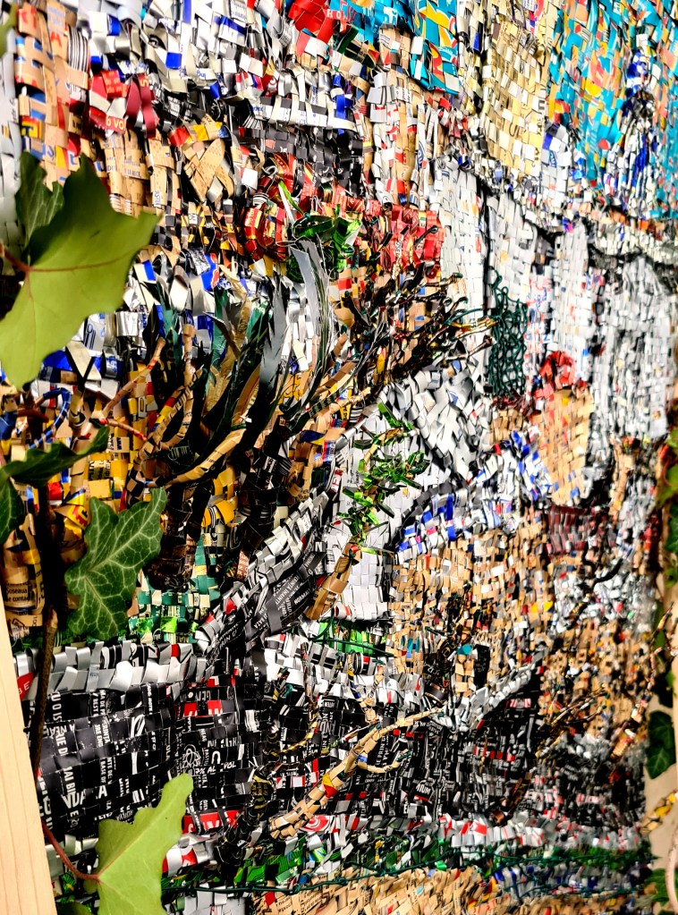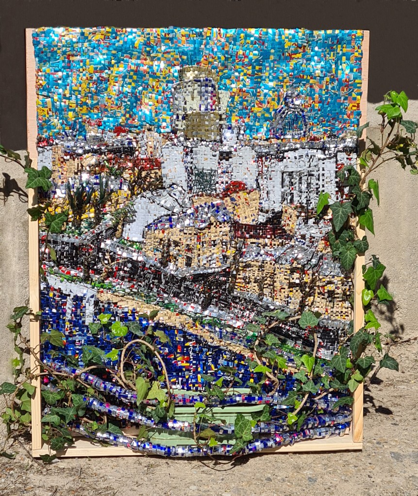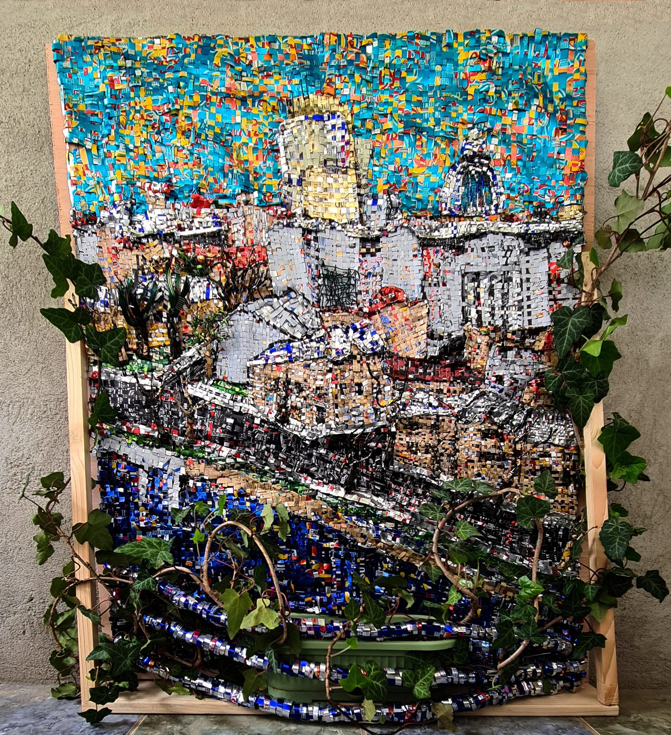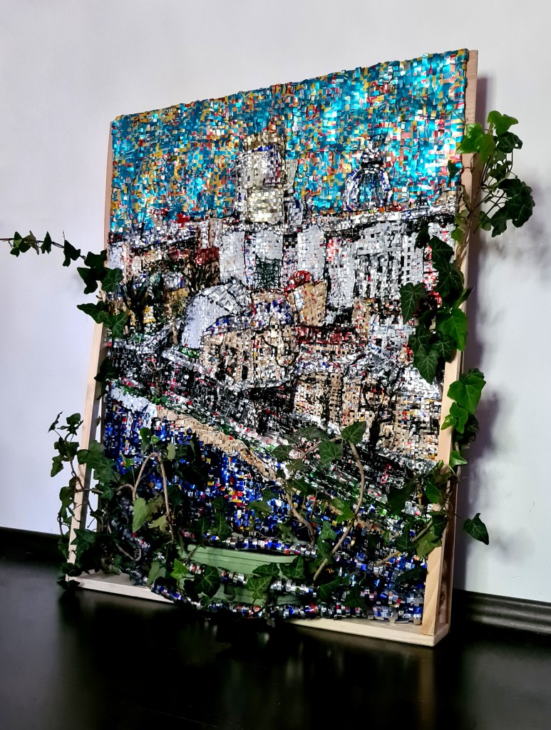 The work is made of recycled aluminium cans cut into strips and weaved on a wire structure fixed on a wood frame.